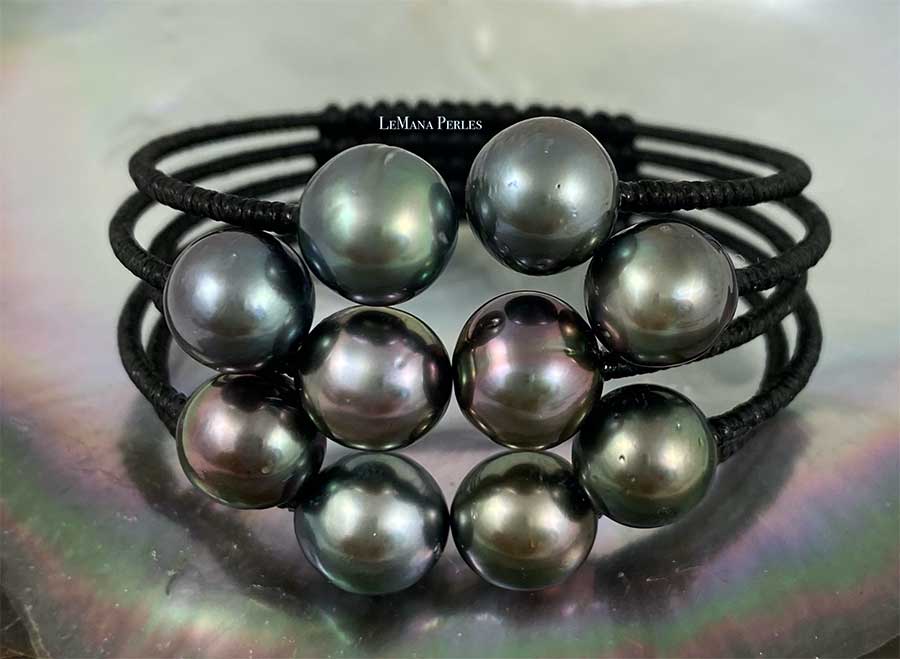 10 Round 9 to 10mm Tahitian pearl cuff bracelet. Made with flexible wire wrapped in durable black polyester cord. Front with pearls open for easy wear.