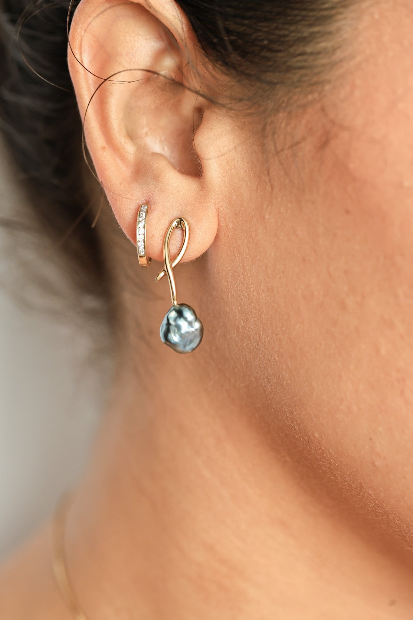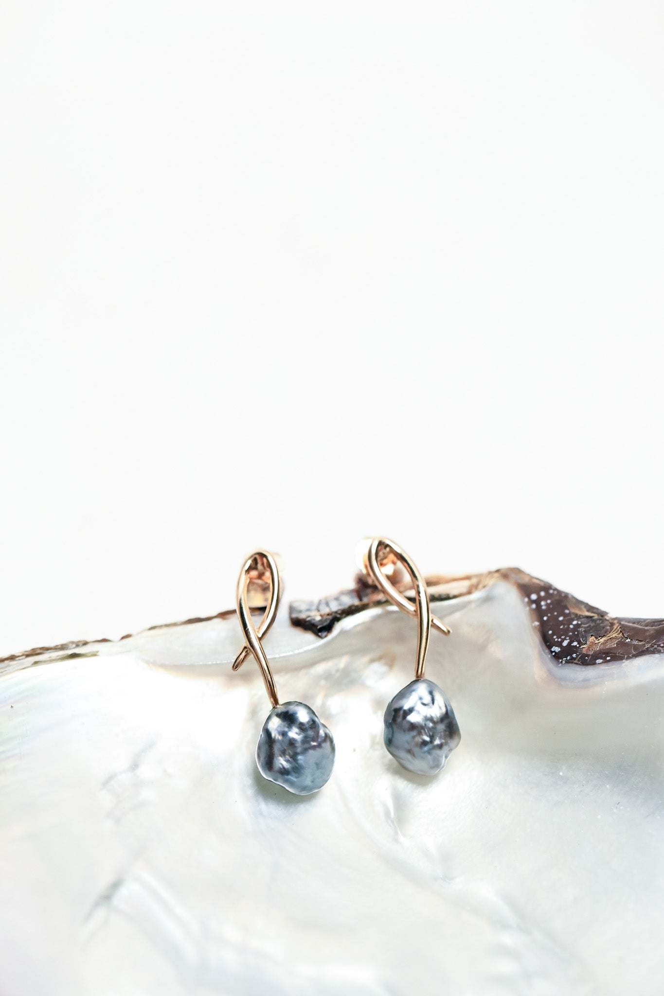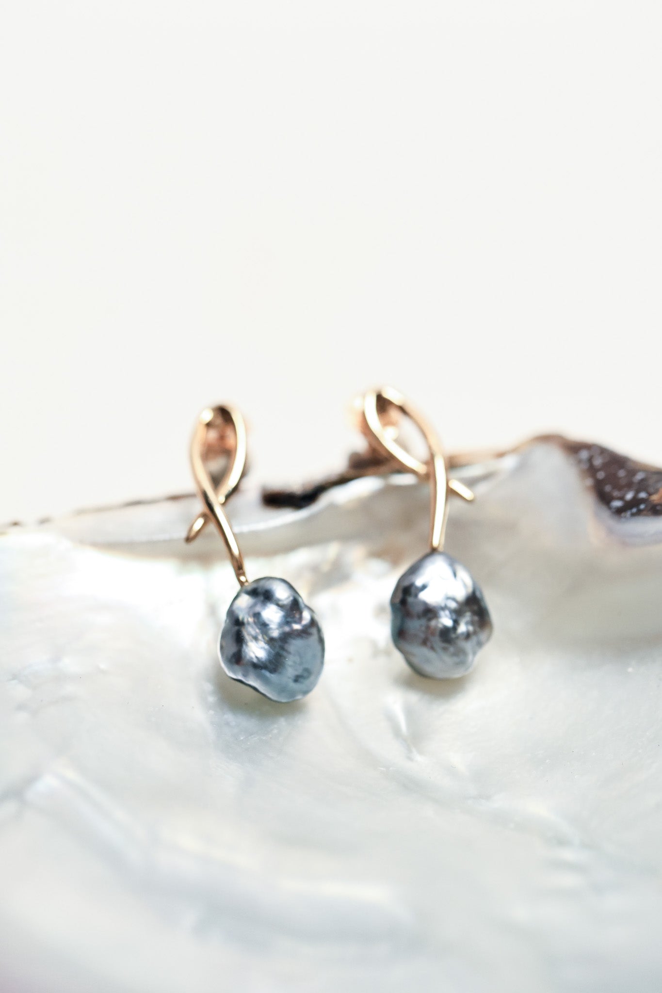 These 14KT gold earrings feature large blue Keshi pearls, celebrated for their unique shapes and lustrous surfaces. Each pair is a singular treasure, varying naturally in size, color, and quality, making them an exceptional addition to any discerning collector’s selection. Their distinctive beauty highlights the organic elegance of Keshi pearls, ensuring a truly one-of-a-kind accessory.