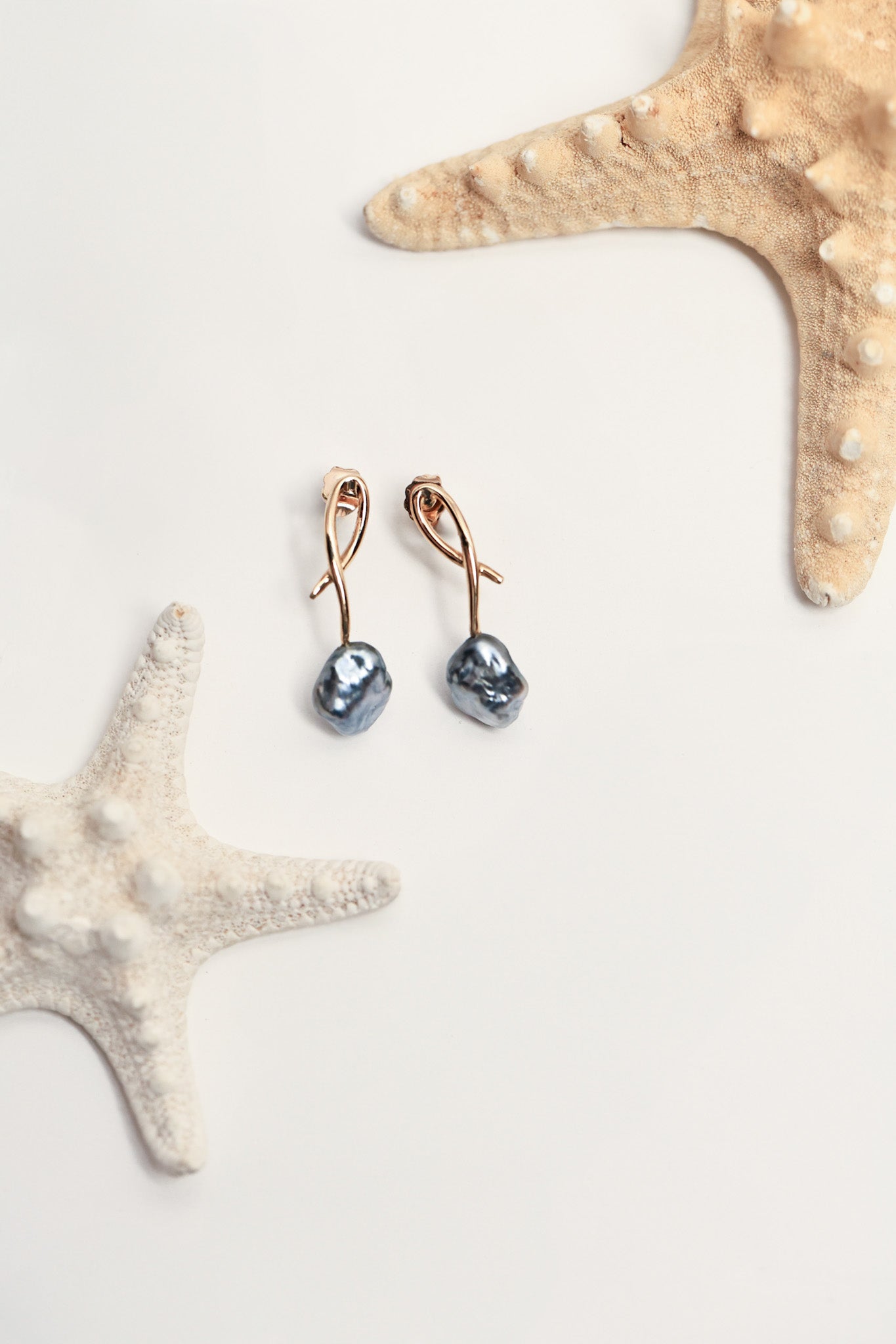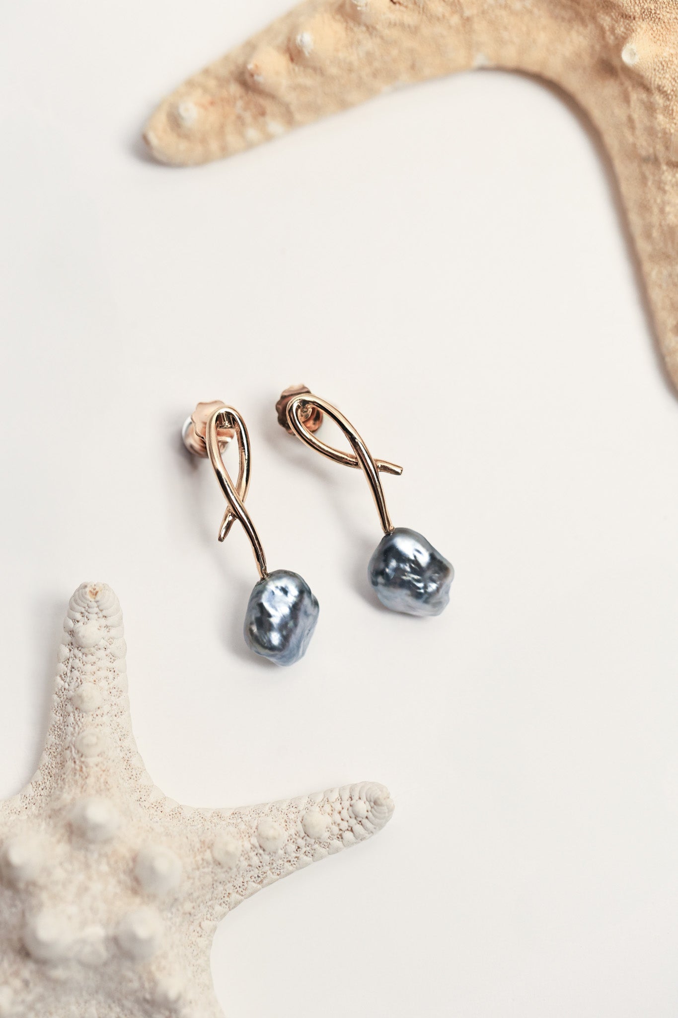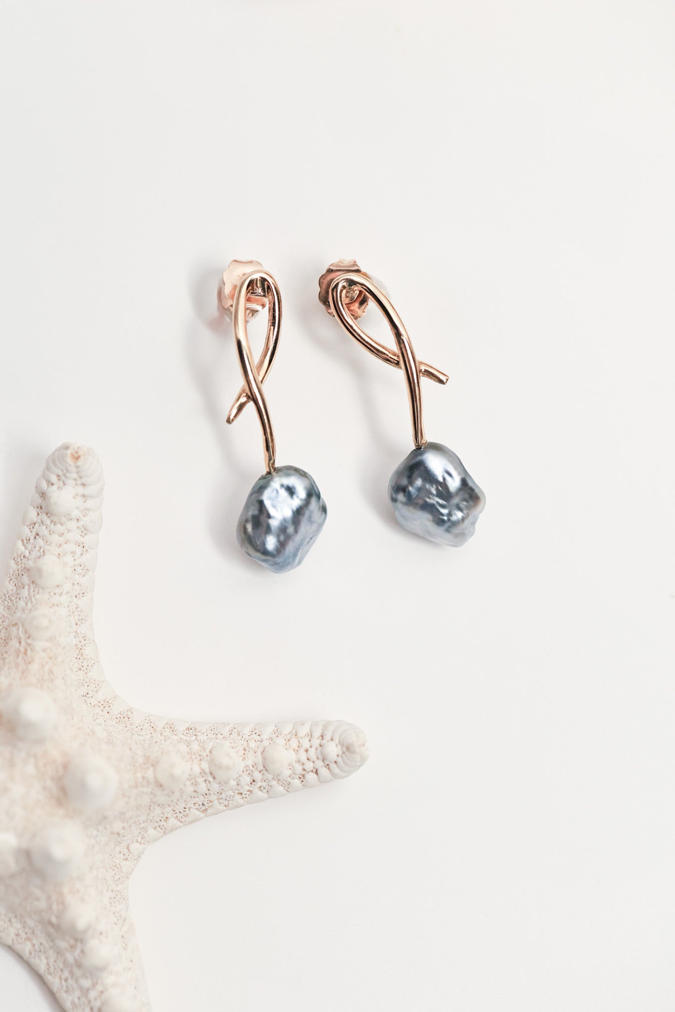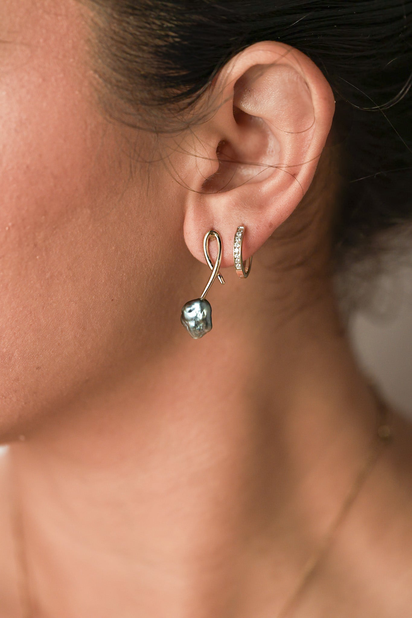 These 14KT gold earrings feature large blue Keshi pearls, celebrated for their unique shapes and lustrous surfaces. Each pair is a singular treasure, varying naturally in size, color, and quality, making them an exceptional addition to any discerning collector’s selection. Their distinctive beauty highlights the organic elegance of Keshi pearls, ensuring a truly one-of-a-kind accessory.