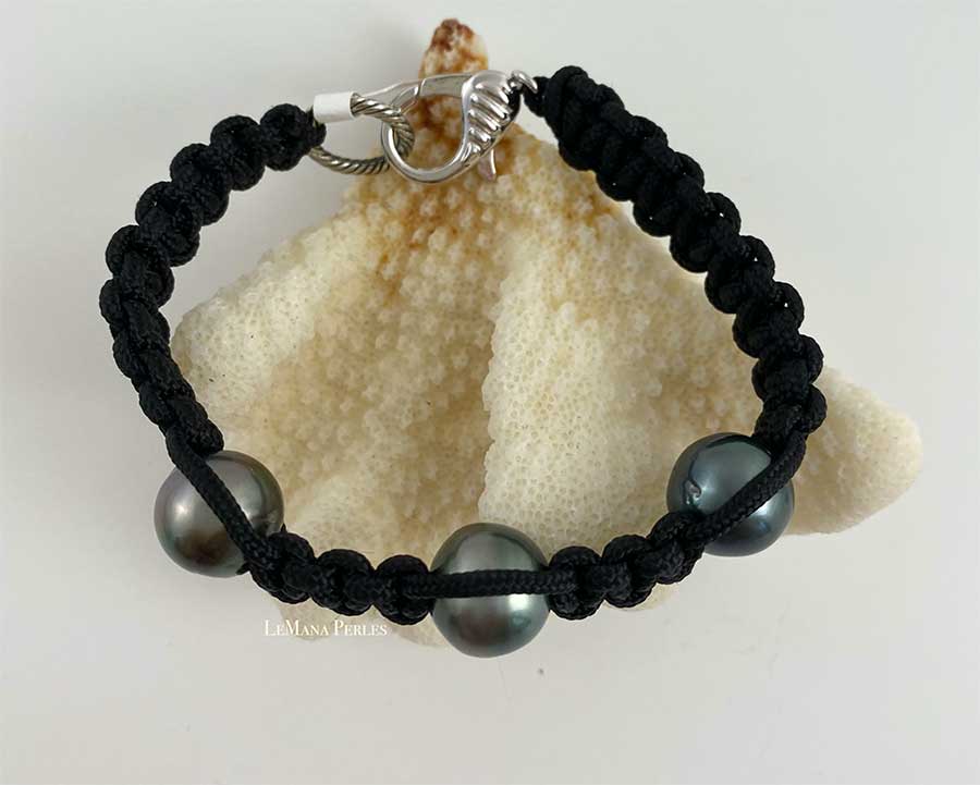 Three Near Round 12mm Tahitian Pearls woven with Polyester/Nylon Cord