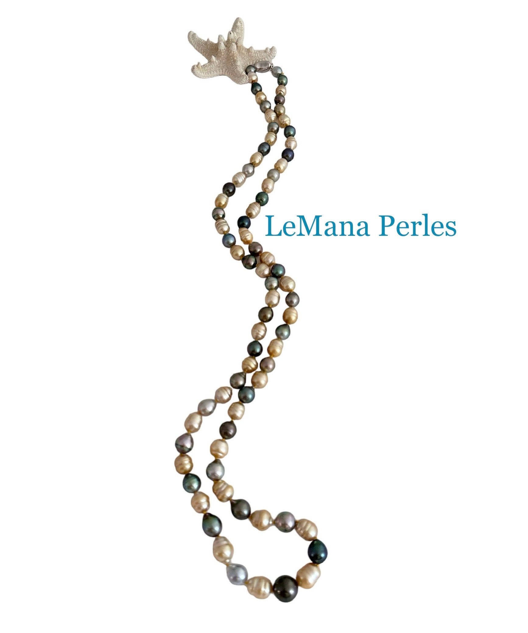 Alohi, to shine, as this long strand glistens with a combination of Tahitian and South Sea Golden Pearls. Knotted with silk and a sterling silver one touch clasp, this necklace is 36 inches. Wear it single or double to work or play. Pair with a Tahitian or Golden earring from LeMana Perles.