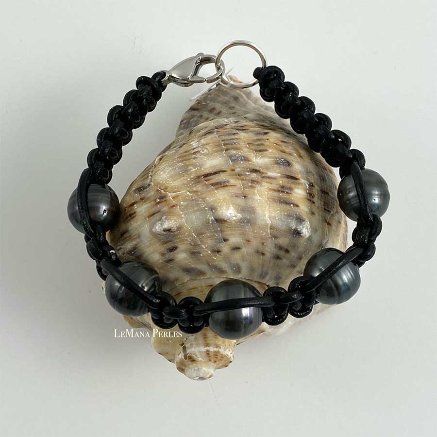 Five 11mm to 12mm Semi Baroque Tahitian Pearls woven with Black Leather