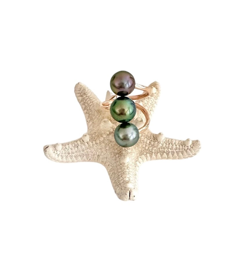3 beautiful Tahitian Pearls with unique color and luster, made with gold filled wire. A great cocktail ring! Made with 9mm-10mm Tahitian pearls on gold filled wire. She is made to last!
