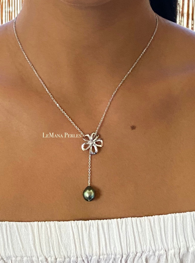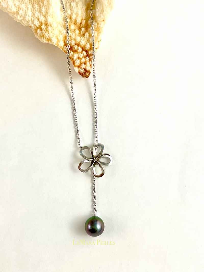 Cut-out Plumeria Flower with 9 mm Tahitian black pearl dangle