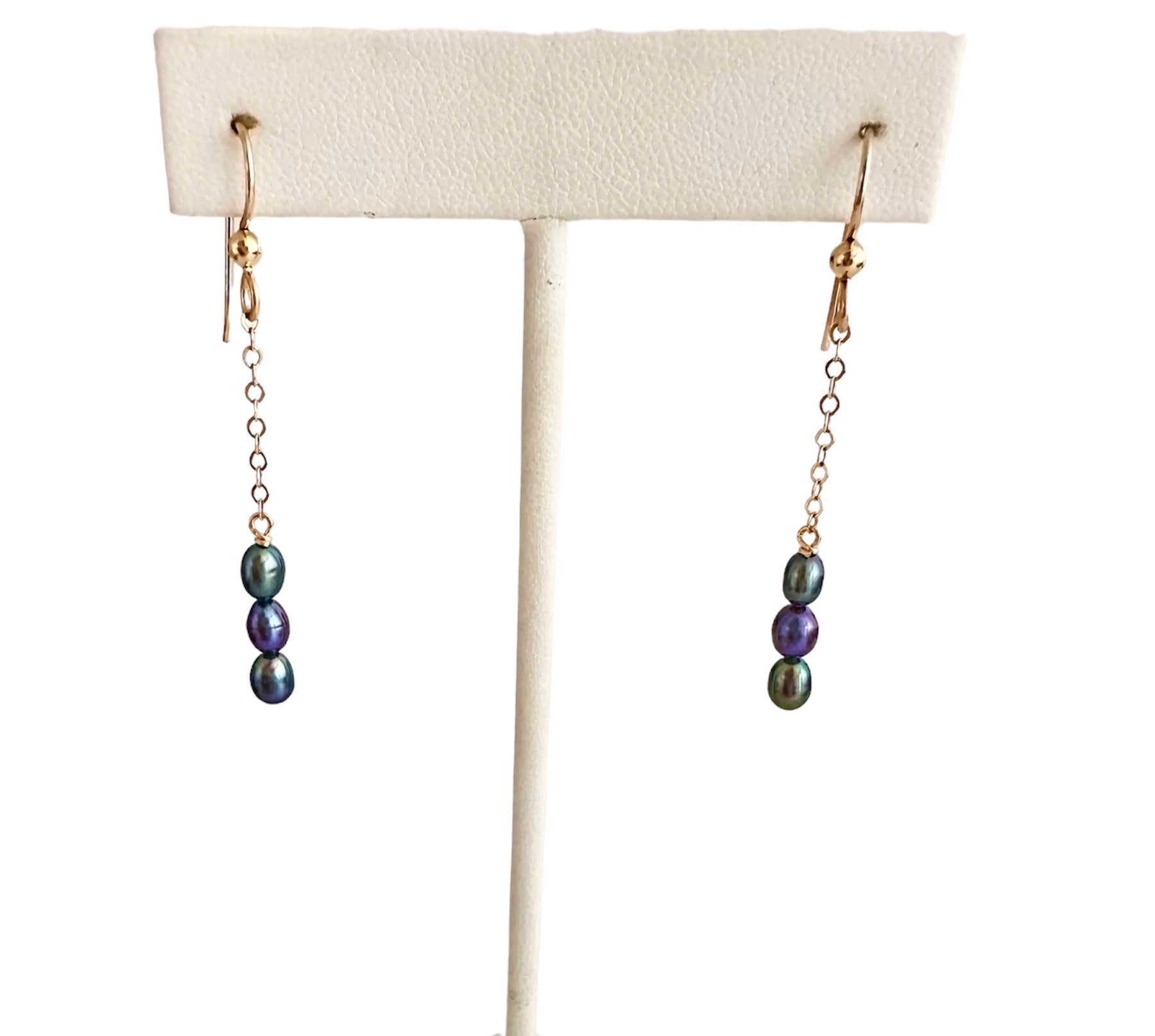The Hilo is famous for its misty rain, the little freshwater pearls represents the little drops of rain in Hilo. It is a 1 1/4 inch dangle with a gold filled chain and ear hook. She glides as you wear this beautiful earrings for day and evening wear.