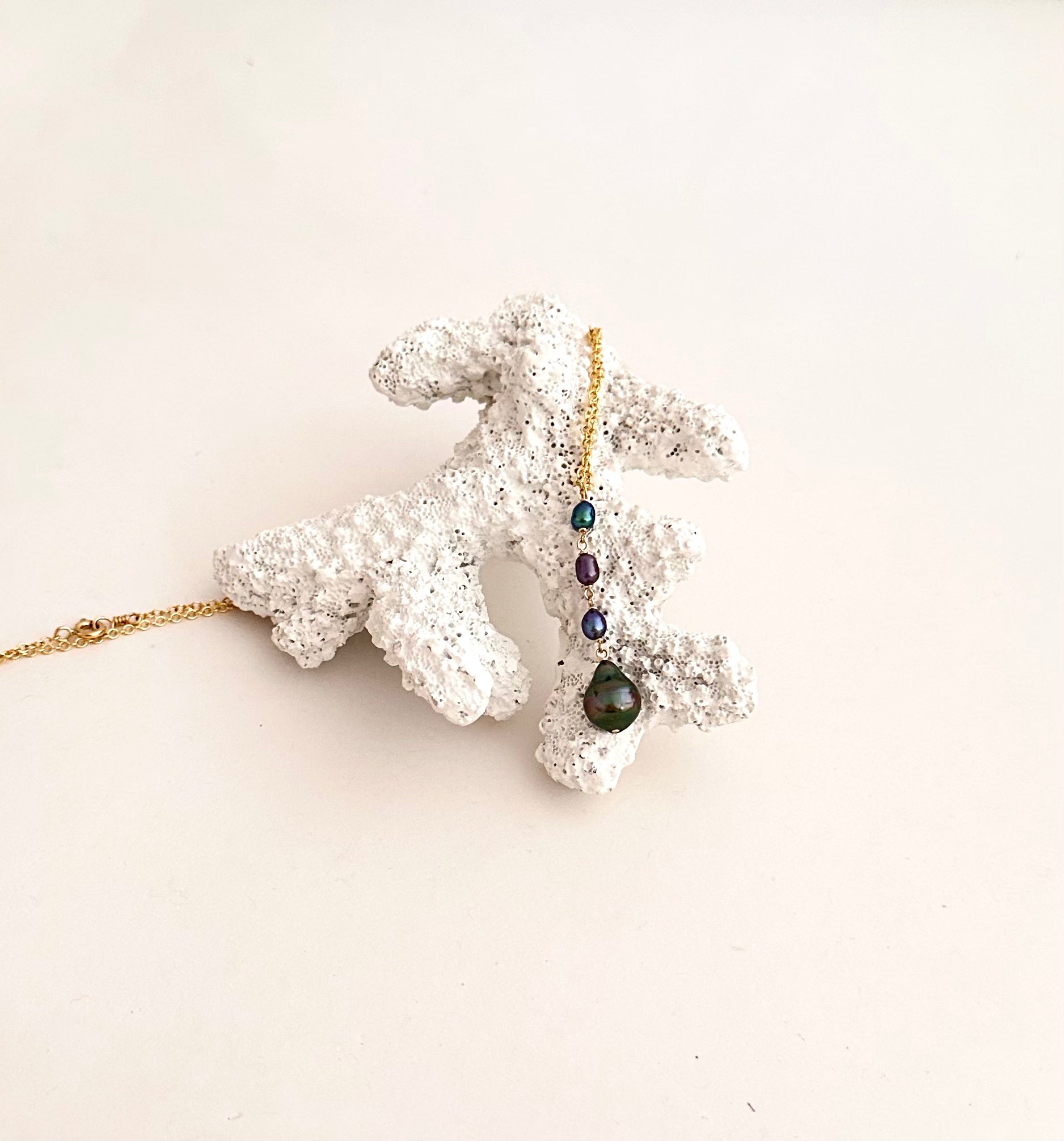 The Hilo is famous for its misty rain, the little freshwater pearls represents the little drops of rain in Hilo. This necklace has a 1 1/2 drop with a t9mm tear drop Tahitian pearl. Made with gold filled chain, select your chain length.