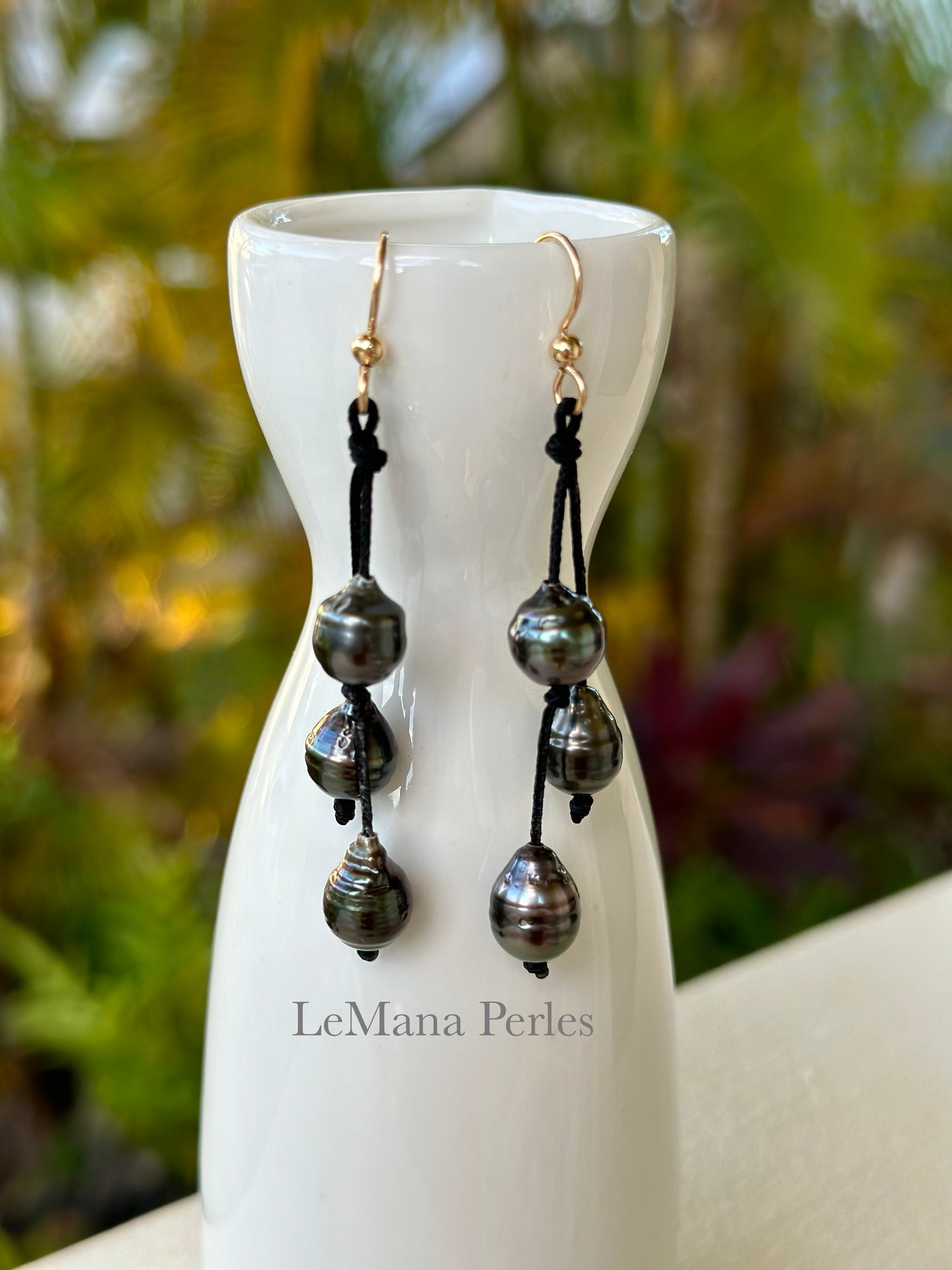 The Ka Wai Earrings have three beautiful, 8-9mm, semi-baroque, Tahitian Pearls on nylon poly-cord with a 2" drop.