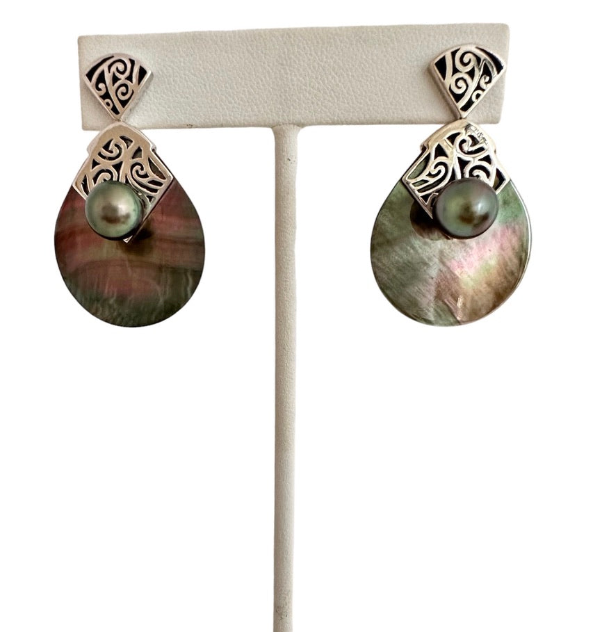 Made with Mother of Pearl and Tahitian Pearl, the metal is sterling silver and rhodium coated.