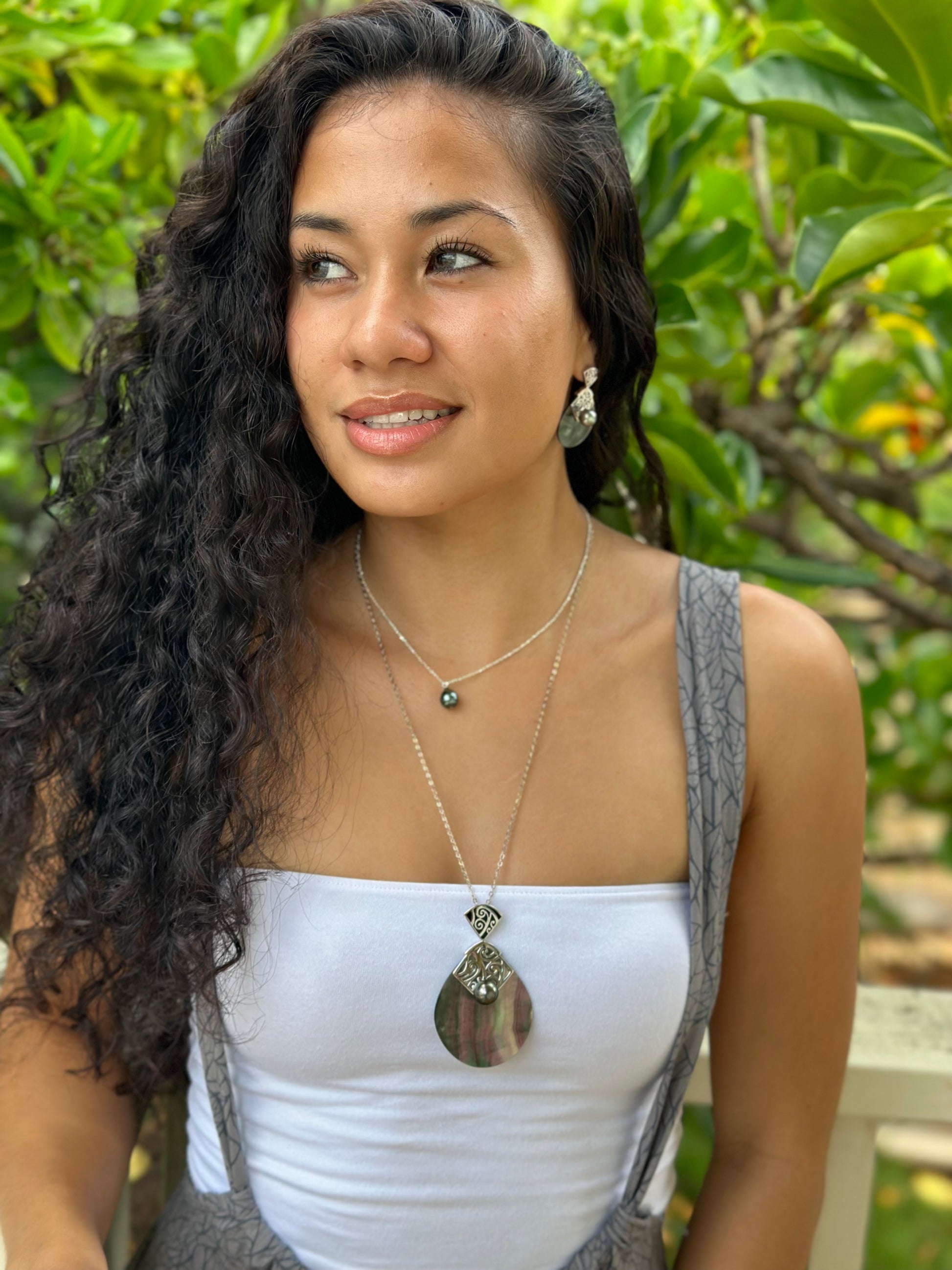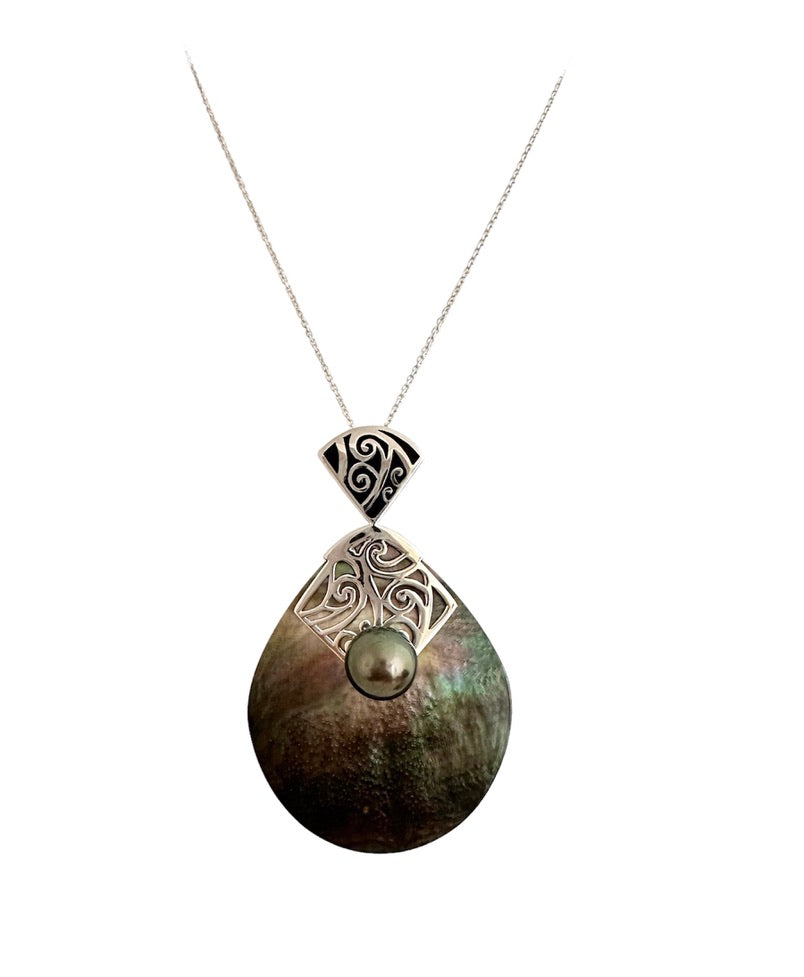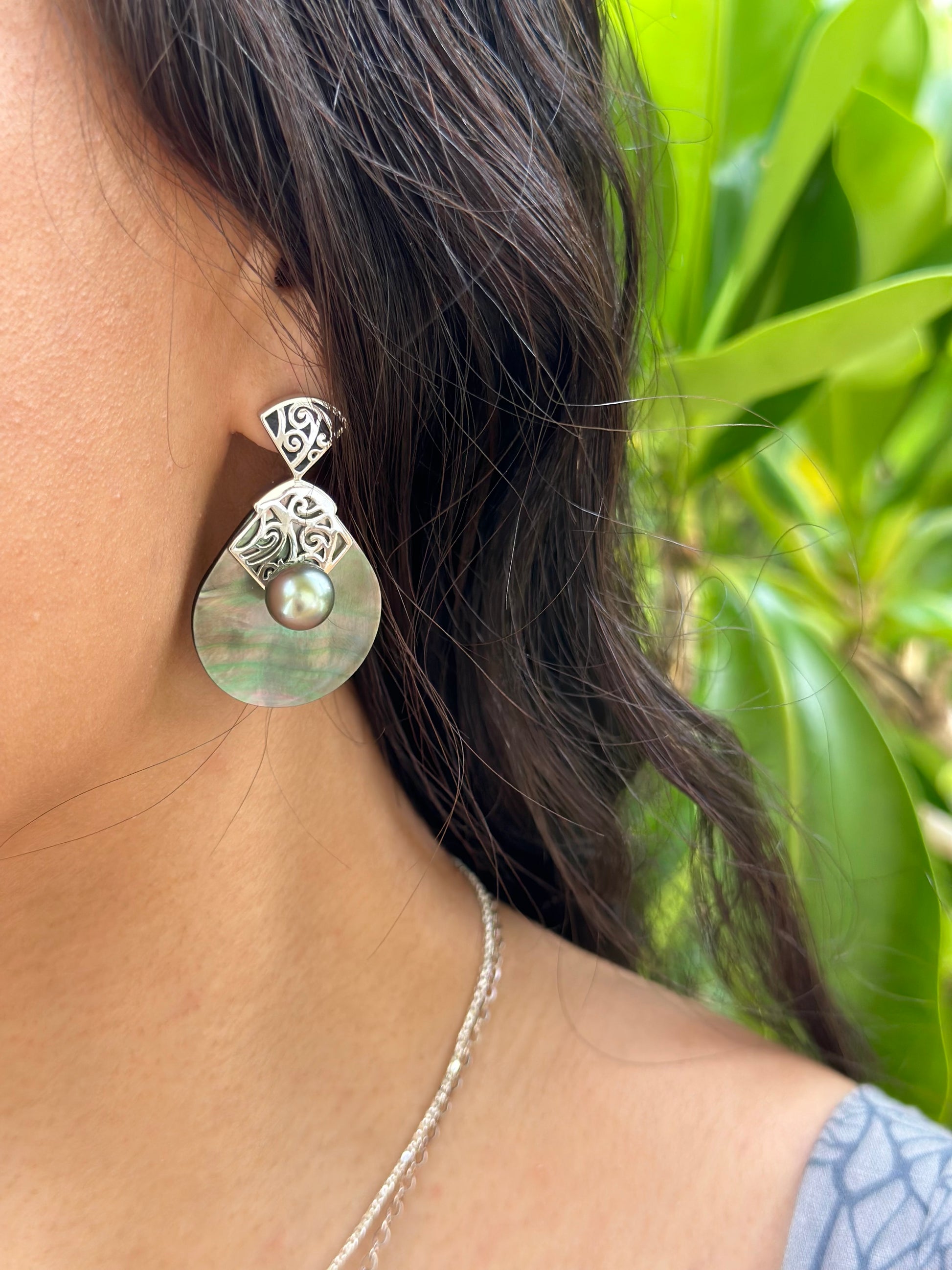 Made with Mother of Pearl and Tahitian Pearl, the metal is sterling silver and rhodium coated.