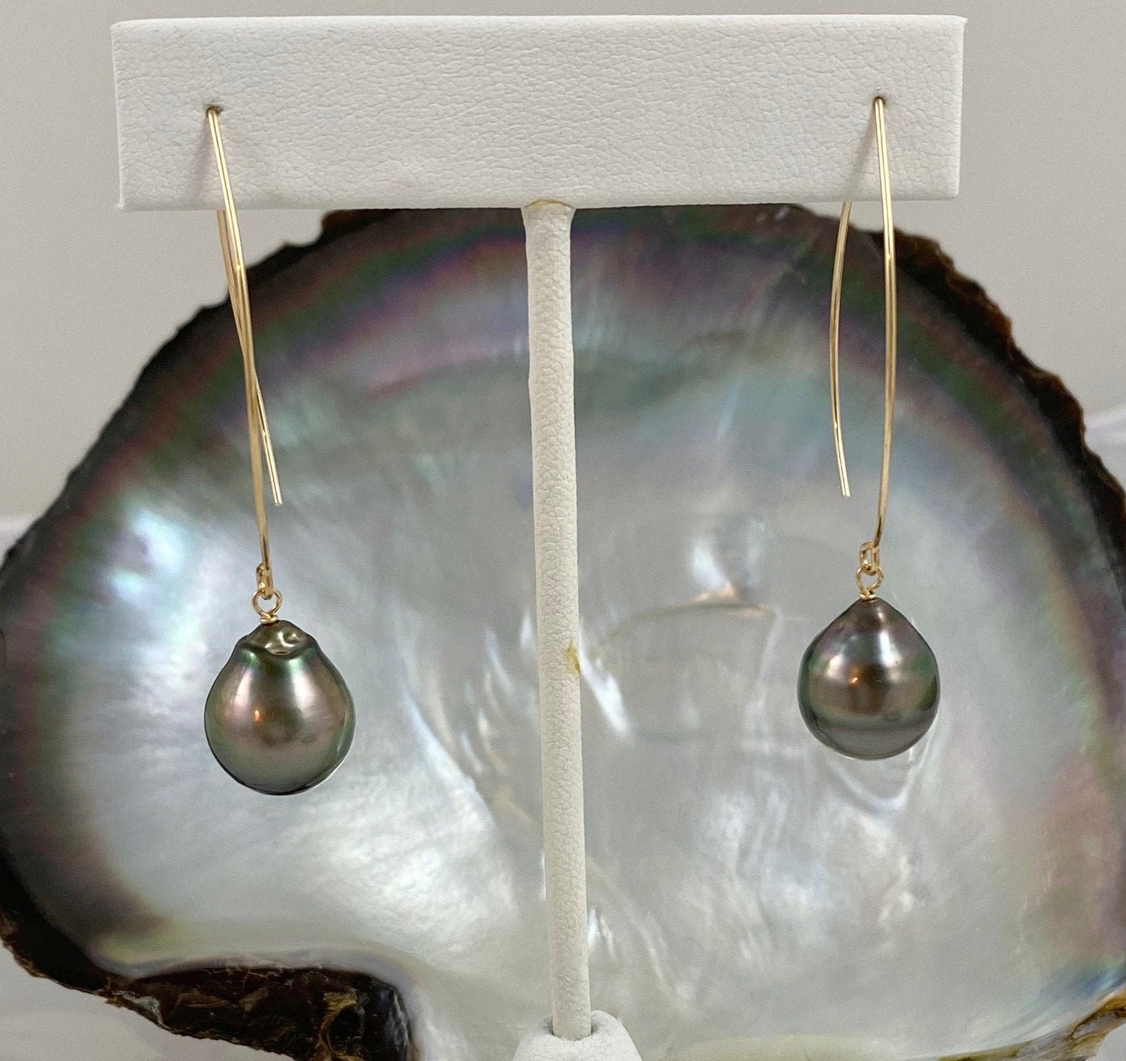 Large 12 – 13 mm baroque Tahitian pearls dangle on Shepard’s Hook ear wire. These beautiful earrings look great with everything and are sure to be your favorite pair. Available in Gold-filled or Silver.