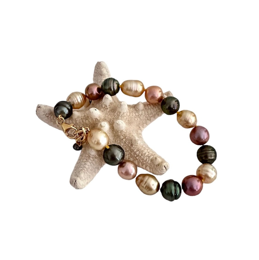 Lokahi means unity. These are Tahitian, South Sea Golden and Pink Freshwater pearls. We are different and live in lokahi. Made knotted with silk string and gold filled chain and clasp. Measure your wrist with about .25" more for an accurate fit.