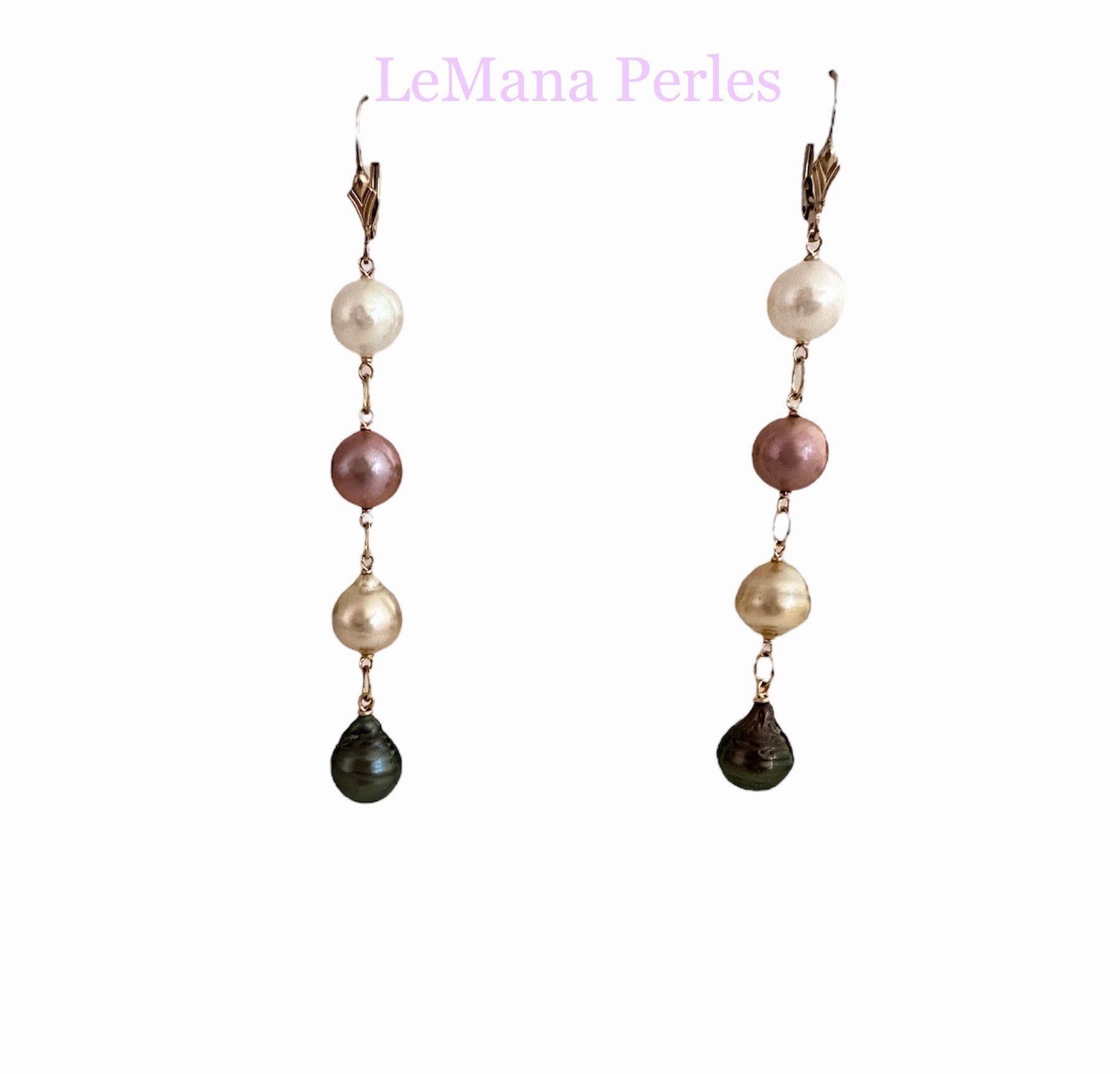 Lokahi means unity. These are Tahitian, South Sea Golden and Pink Freshwater pearls. We are different and live in lokahi. Wear with our Lokahi Necklace and bracelet, this earring is made with gold filled chain and lever back earring post. She dangles at 3 inches to show off each unique semi baroque pearl.