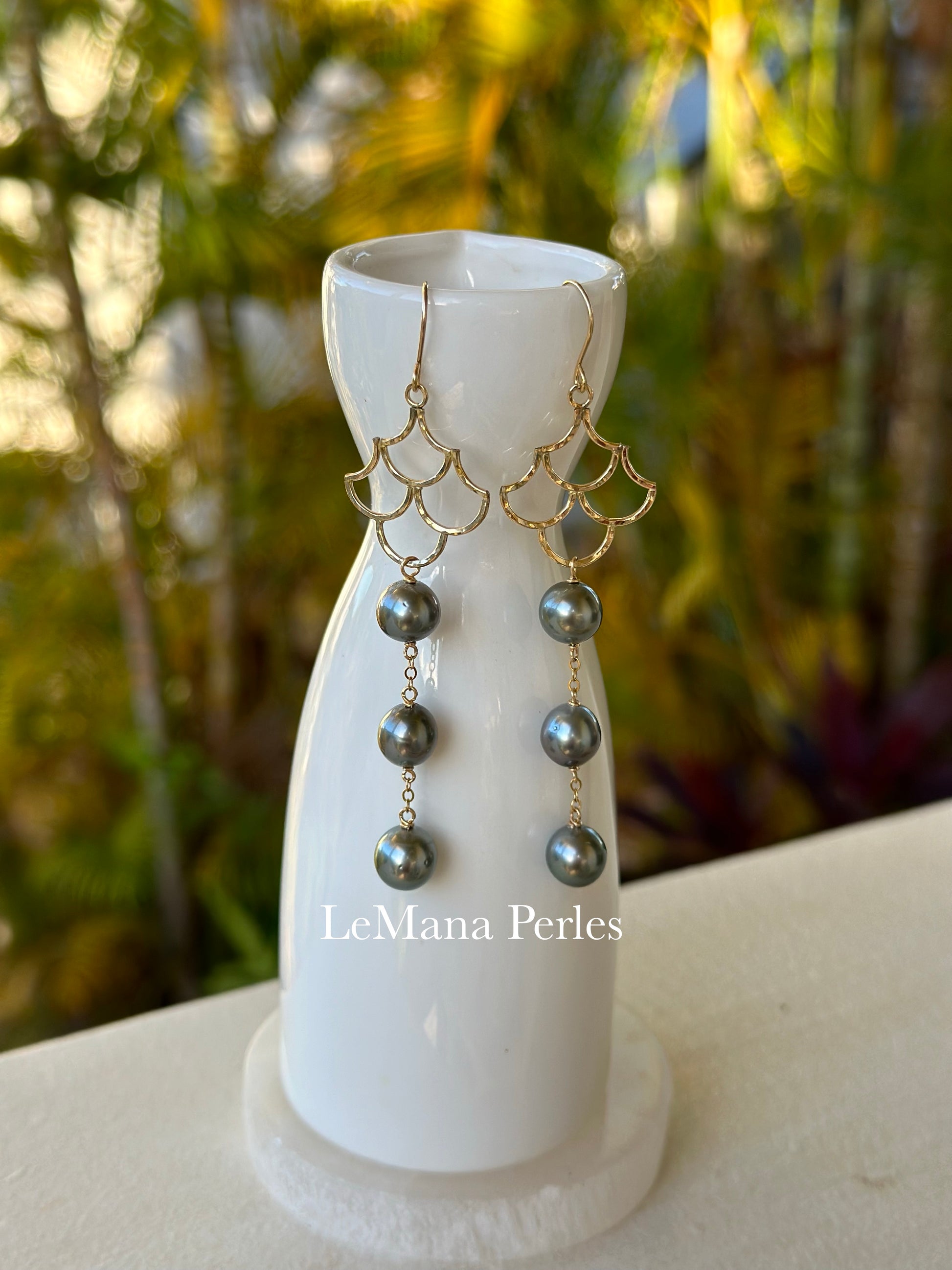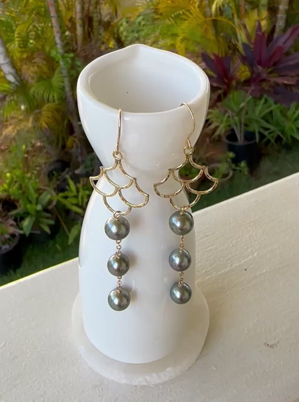 This earring is made with 3 near round Tahitian pearls on each side. A beauty to represent calmness and life together with wai also meaning water.