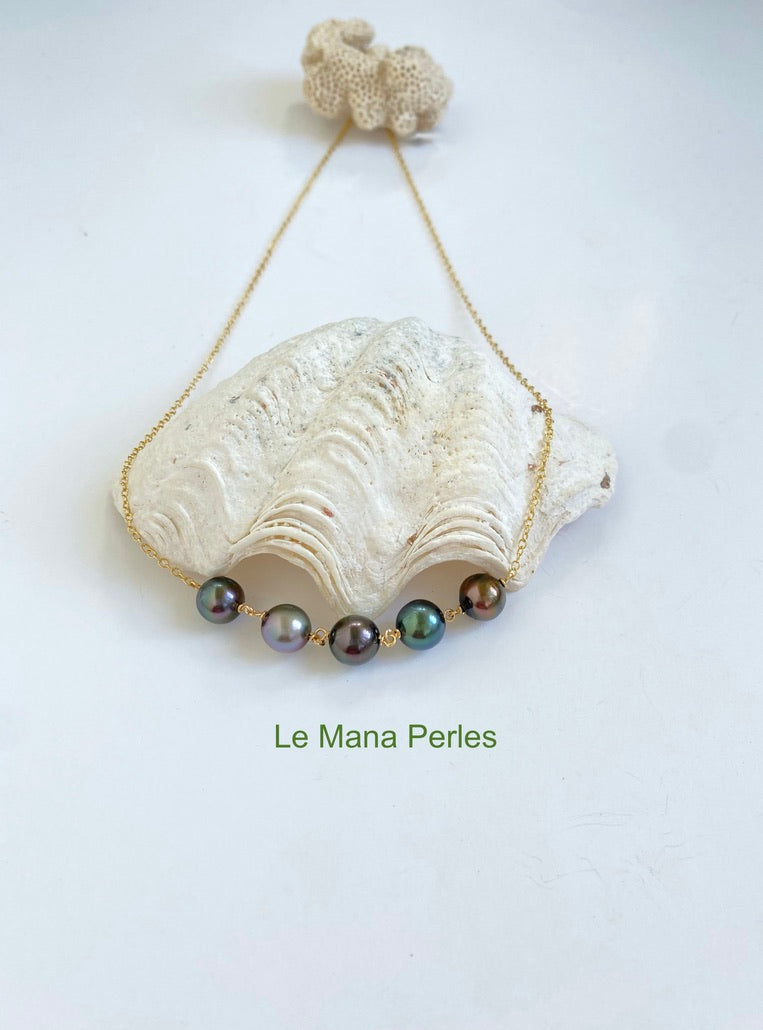 Pa'a means solid or stuck. In this piece, five Tahitian pearls are wired close to each other, pa'a. This necklace made with gold filled cable chain with 9-10mm Tahitian B quality pearls.
