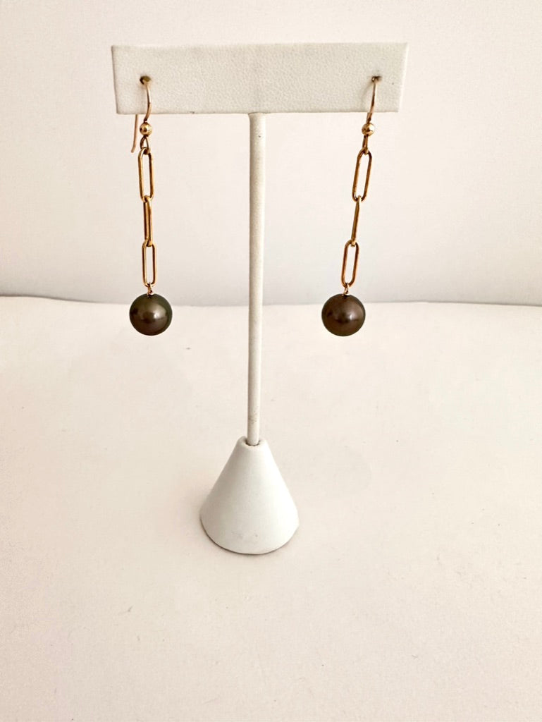 Beautiful 9 mm, Tahitian pearls dangle from gold-filled, paperclip chain, two inch in length.