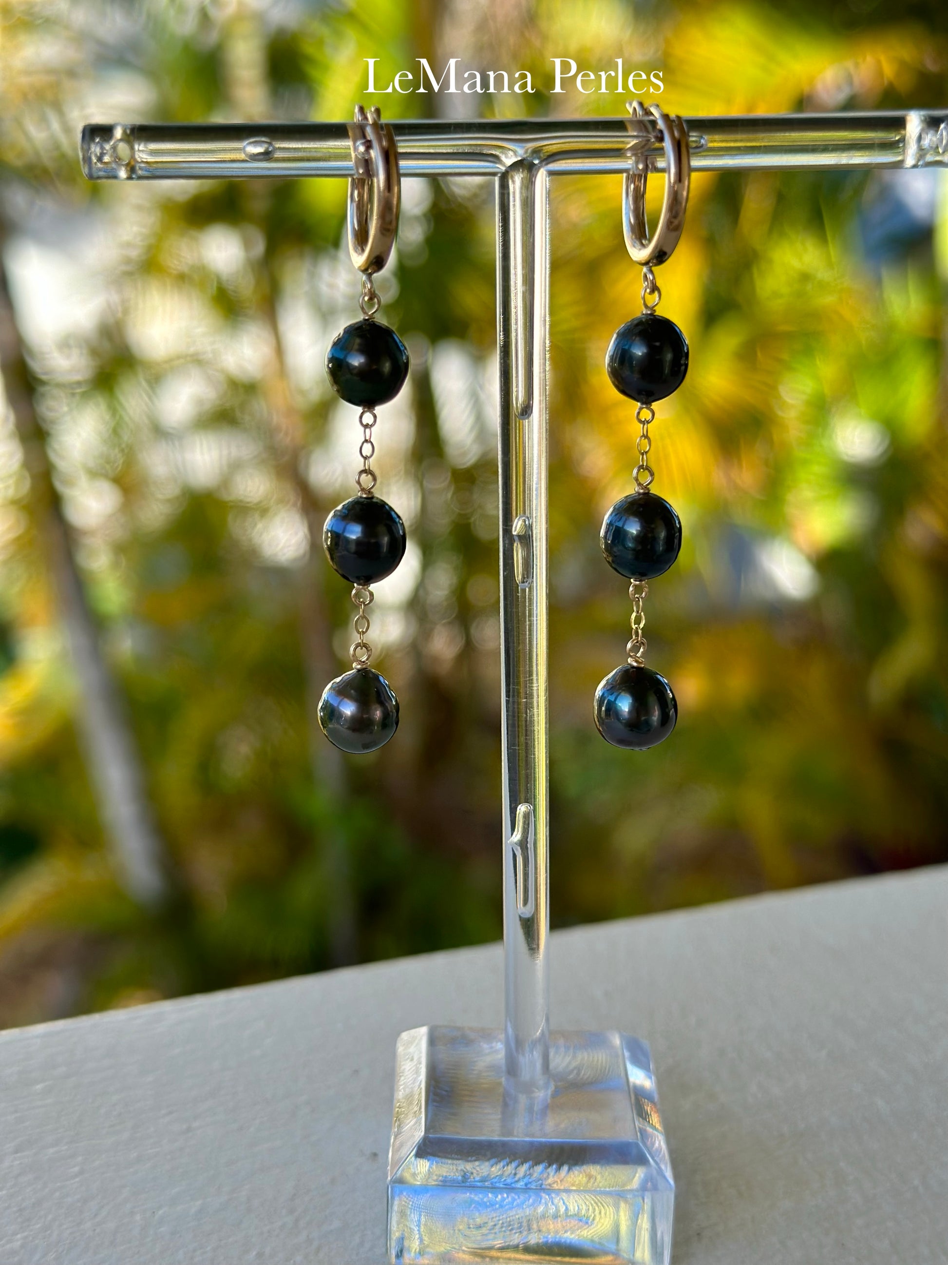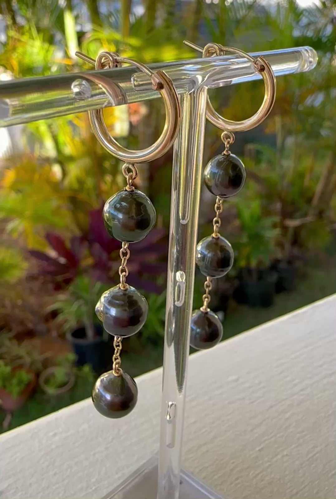 This 3 drop Tahitian pearl huggie hoop earring drops 3 inches.