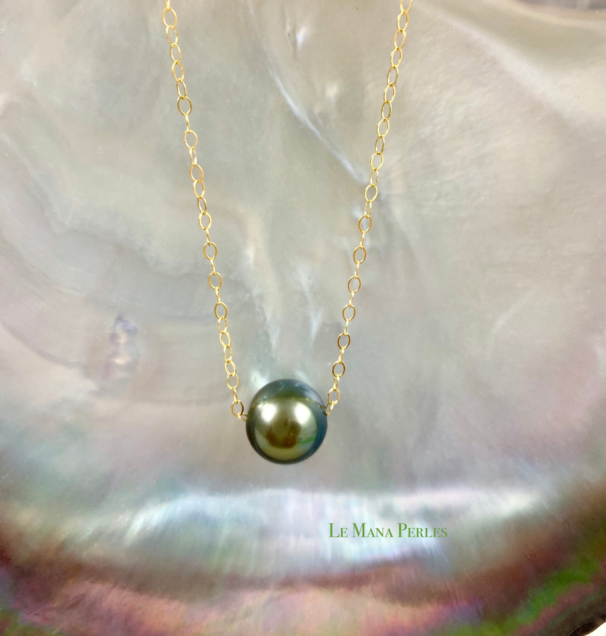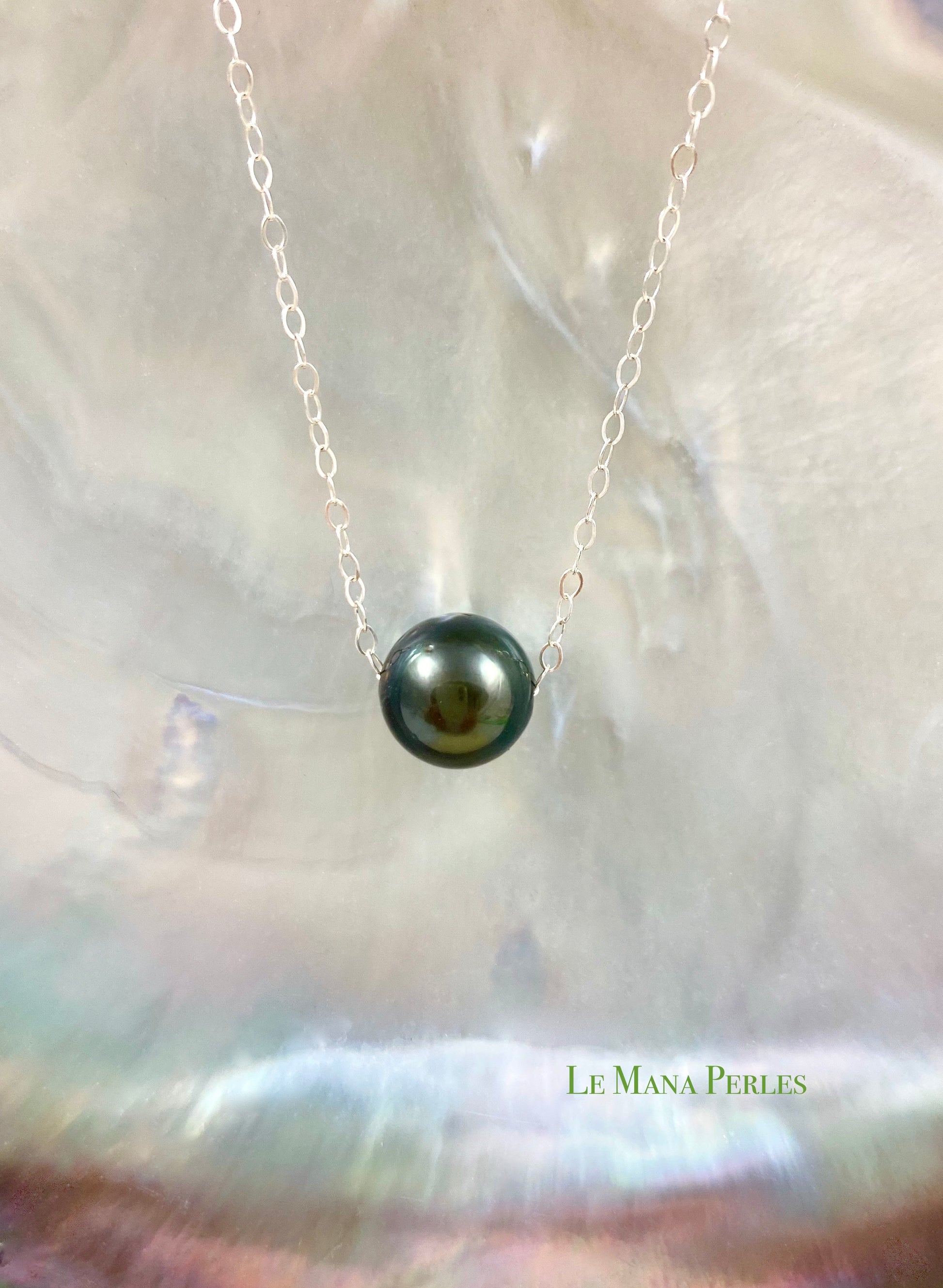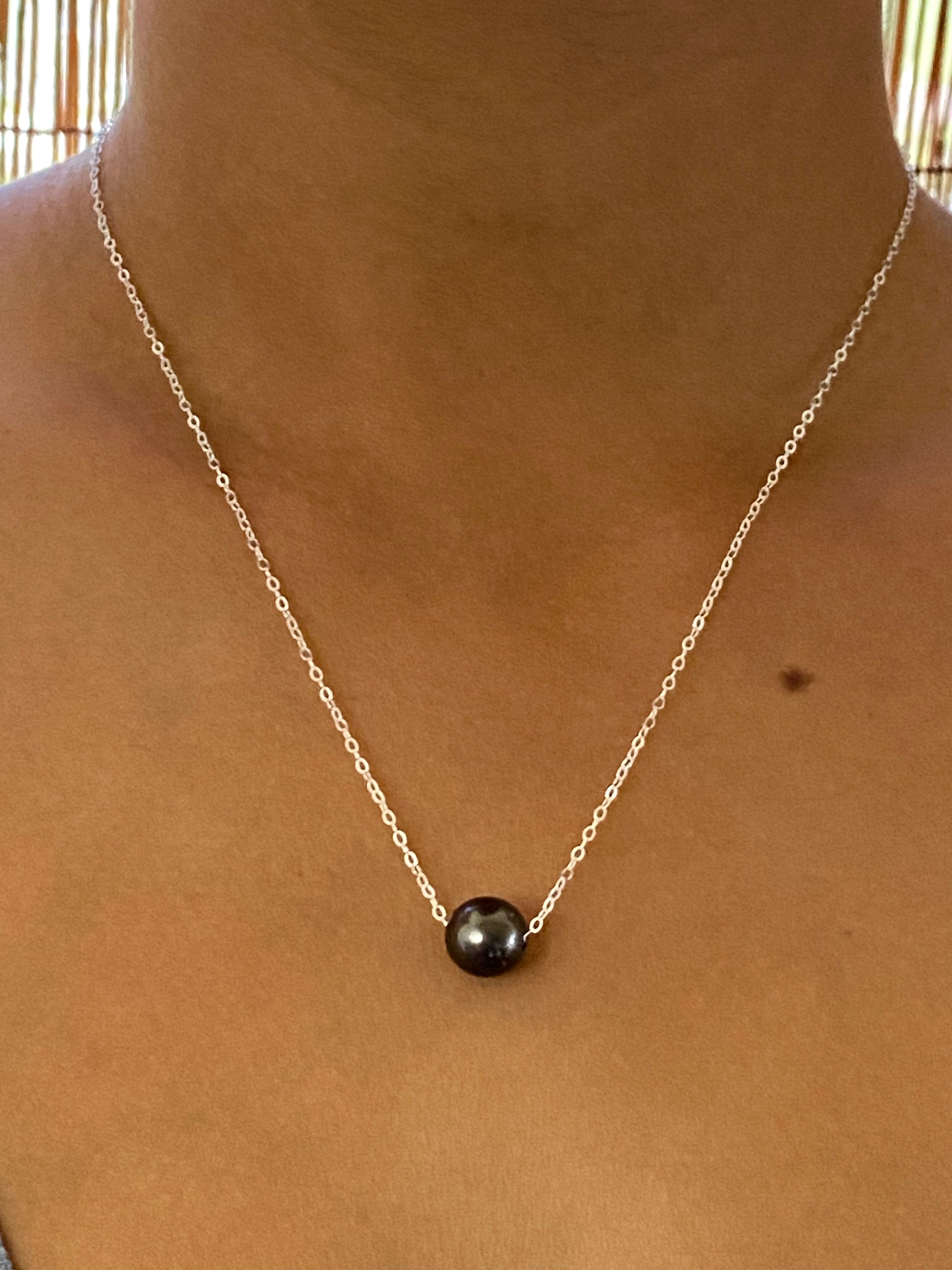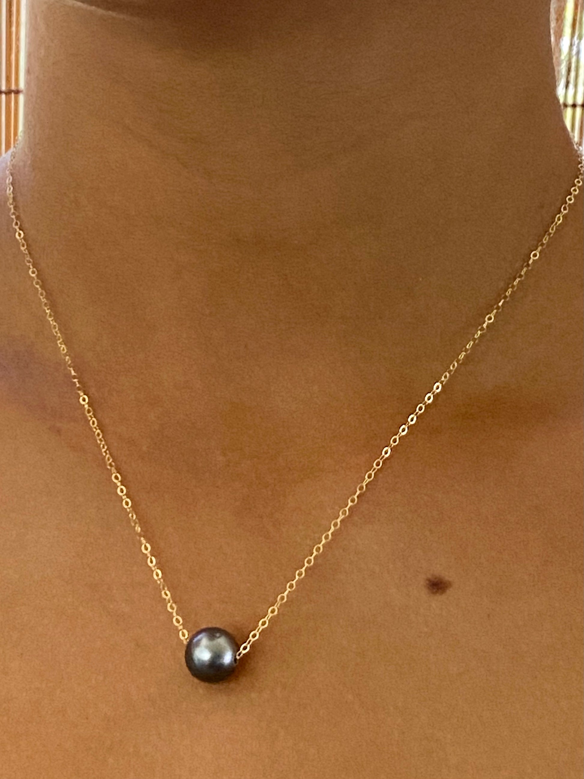 The Tahitian Pearl is 9 to 10mm on your choice of gold filled or sterling silver chain. Pick the length that is good for you. Choose from 16 to 20 inch chain length. Layer with your favorite pieces or wear alone. Makes the perfect gift for any occasion.