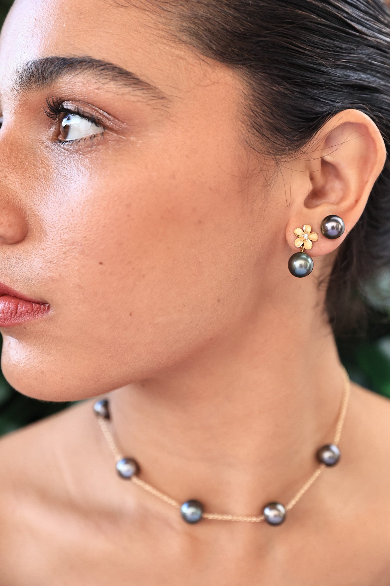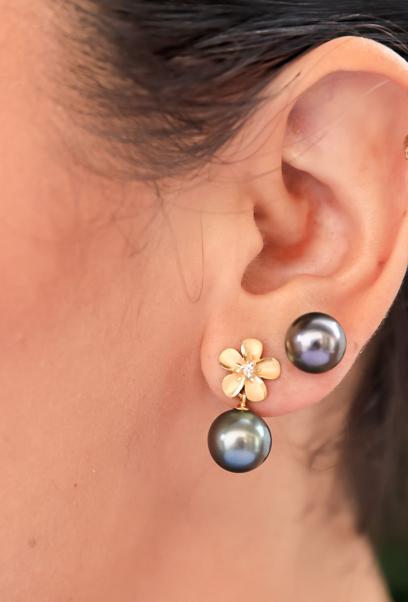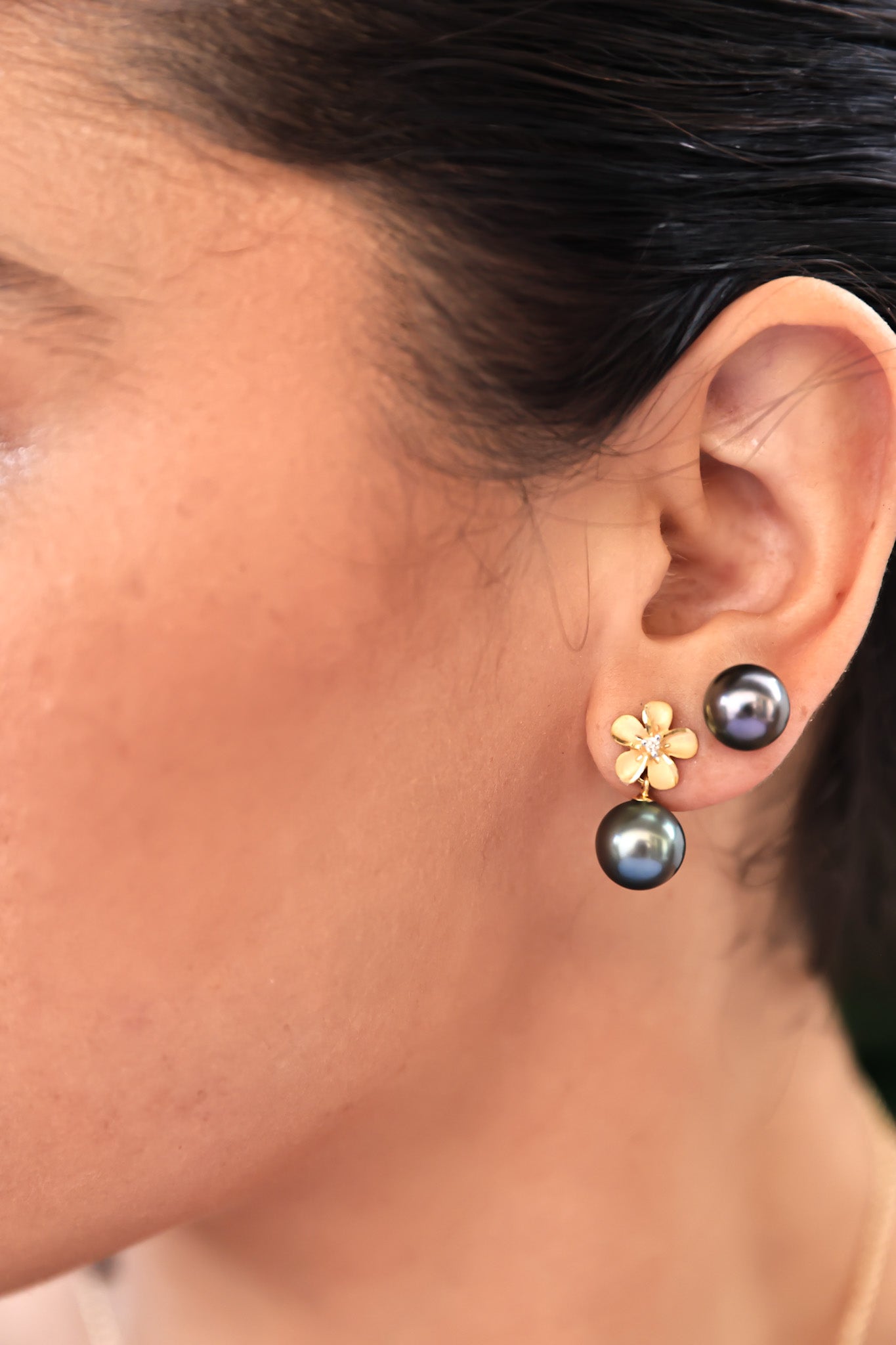 Tahitian Pearl & Pua Melia Stud Earrings | 14KT Gold & Diamonds