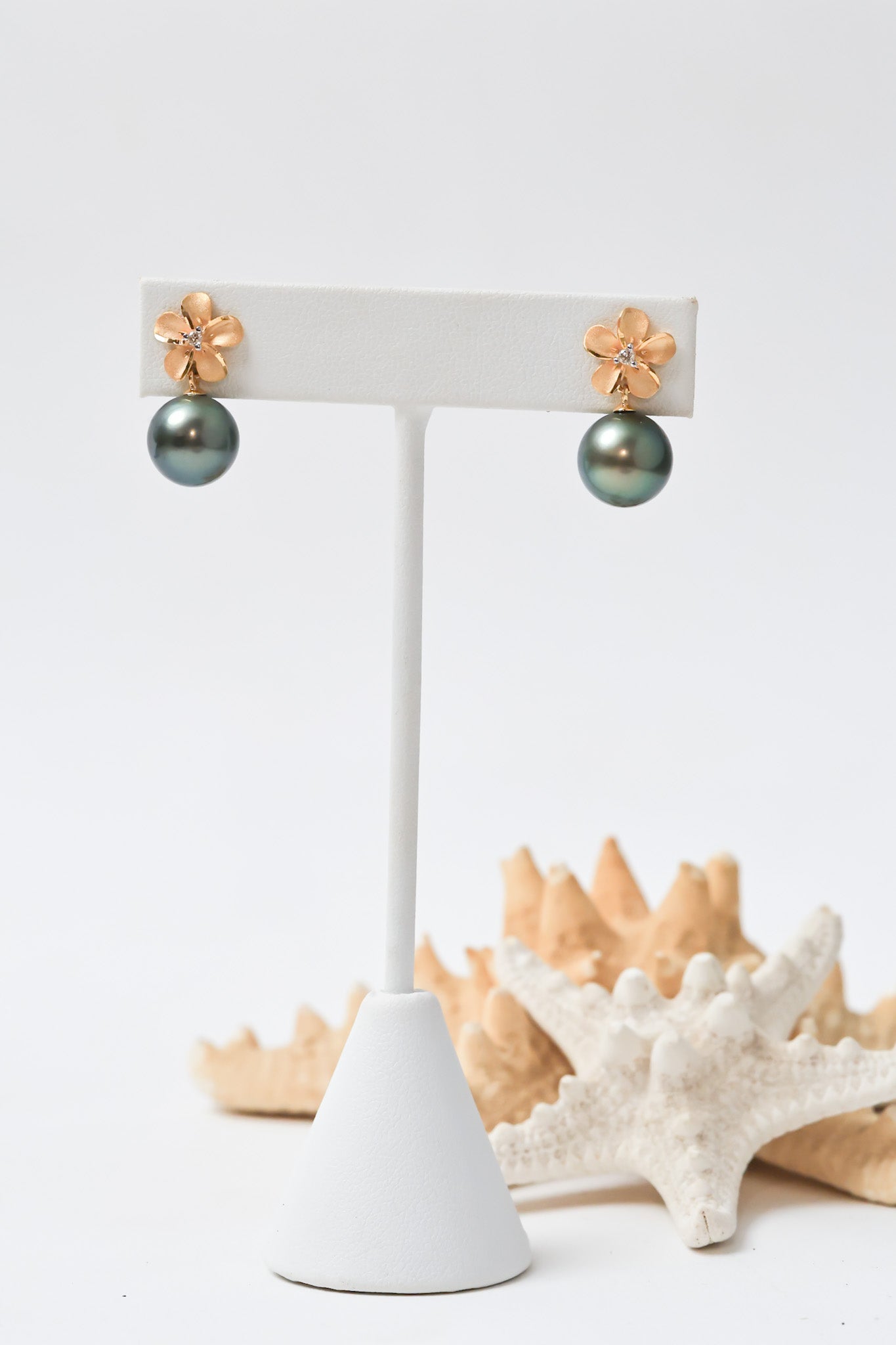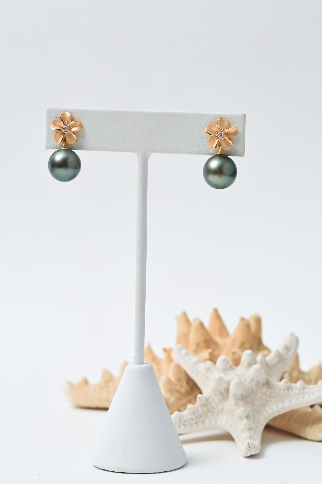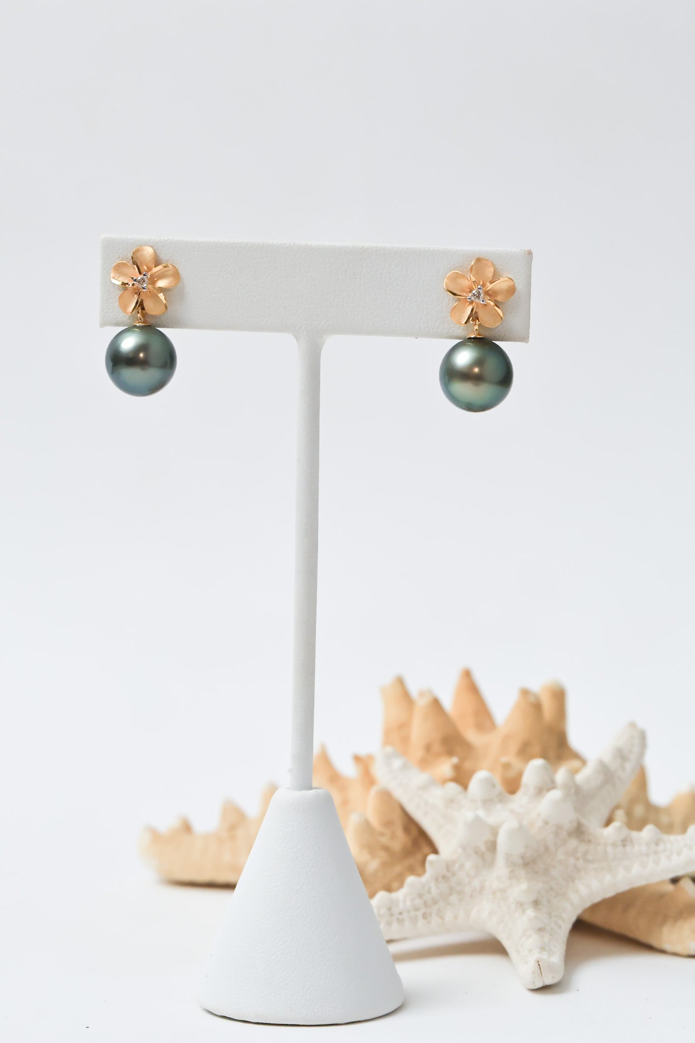 Tahitian Pearl & Pua Melia Stud Earrings | 14KT Gold & Diamonds
