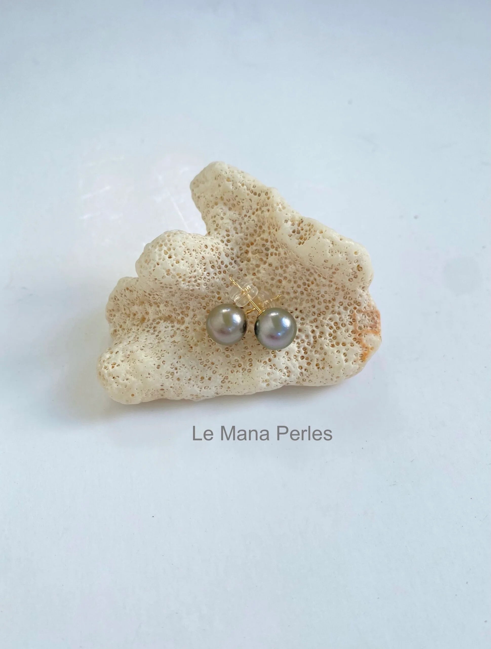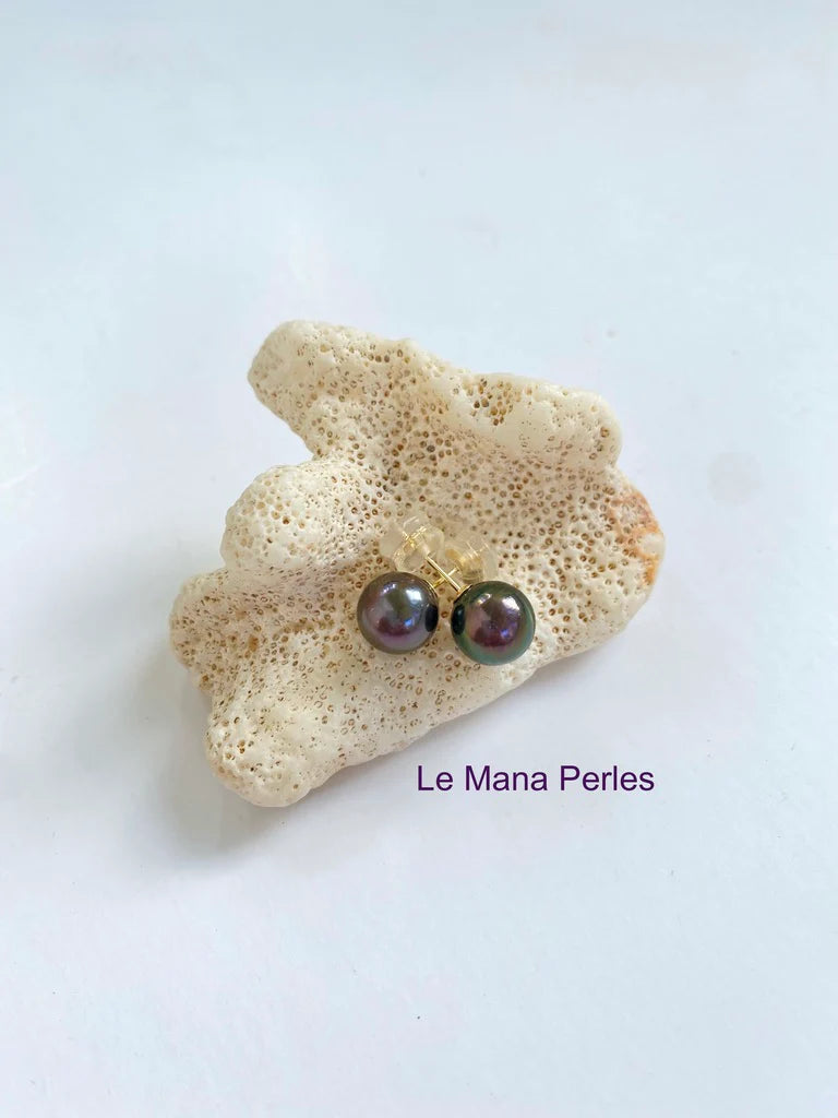 Beautifully paired Tahitian pearl studs, 8 to 10 mm in 14k yellow gold post and backing. Request your overtone color in the comments. Colors will vary with natural pearls.